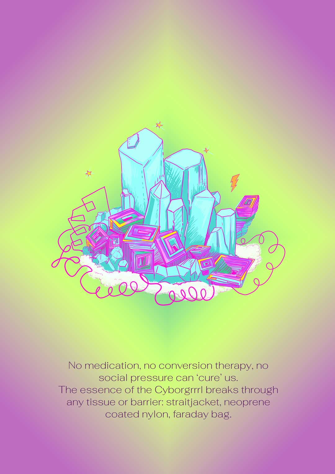 Cyborgrrrls bring attention to techno-cultural practices located in the Latin American context. They reconfigure notions of technology, including crafts, traditional medicine, DIY science, sexuality, care, kin, and ancestral wisdom, combined with current technologies such as code, internet, biohacking, electronics, sound, audiovisual productions and more.