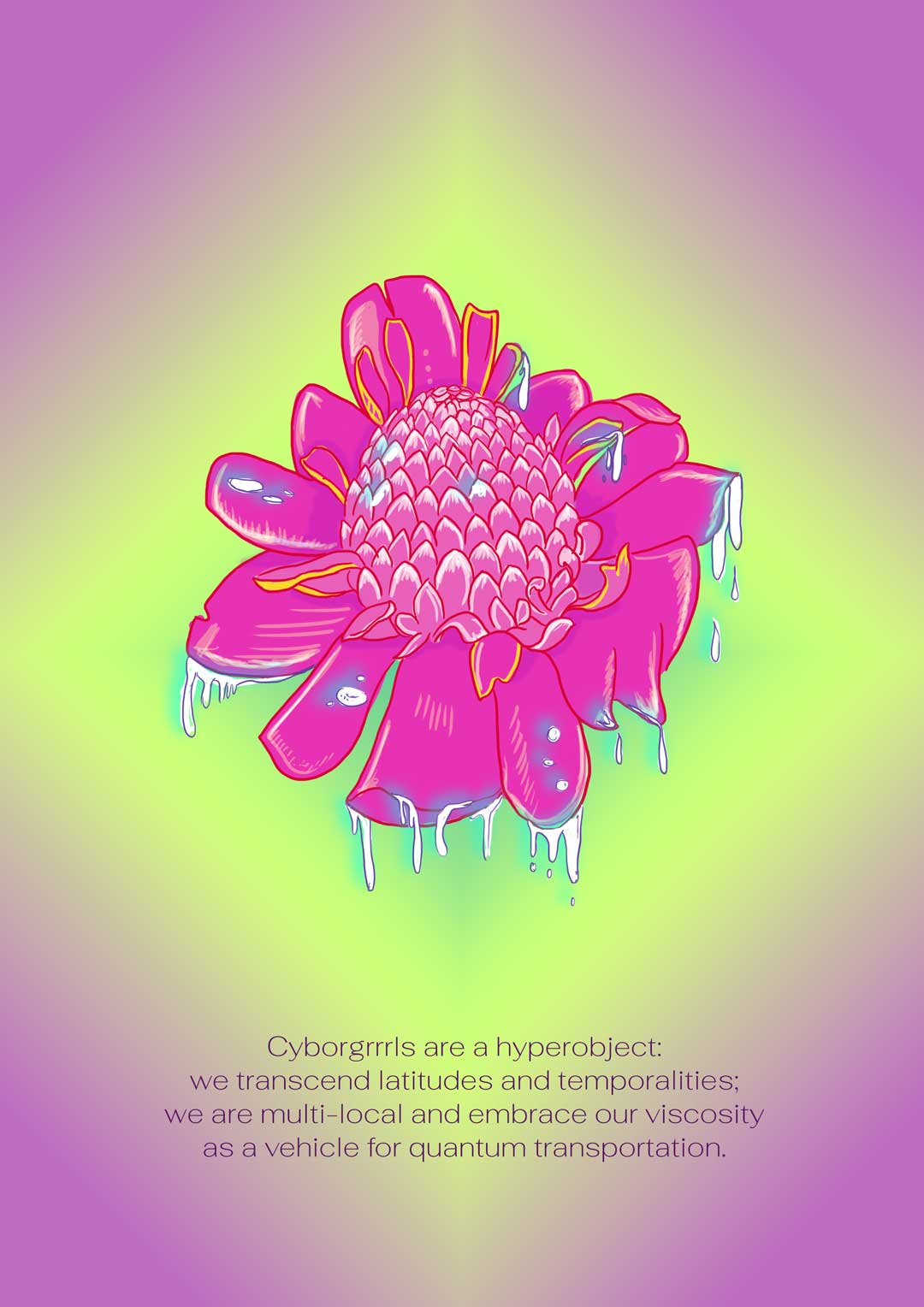 Así, con las patas en puntos lejanos, en posiciones aparentemente desequilibradas, al borde del tropiezo, pero con seguridad, creamos este registro en el mundo virtual y transmitimos este mensaje. – Cyborgrrrls, México-Berlin